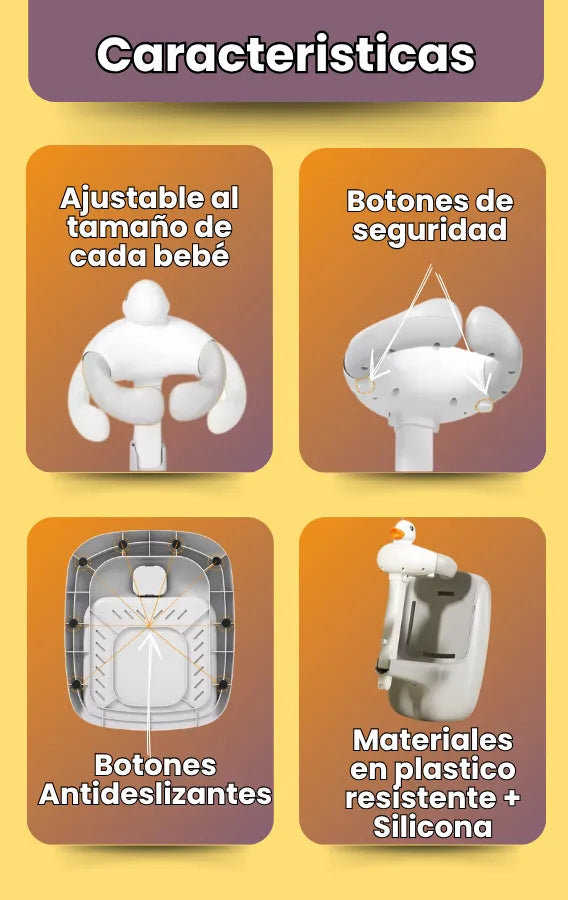 No te preocupes, su base amplia y diseño ergonómico están pensados para bebés inquietos. El soporte permanece firme incluso con movimiento, dándote total tranquilidad.